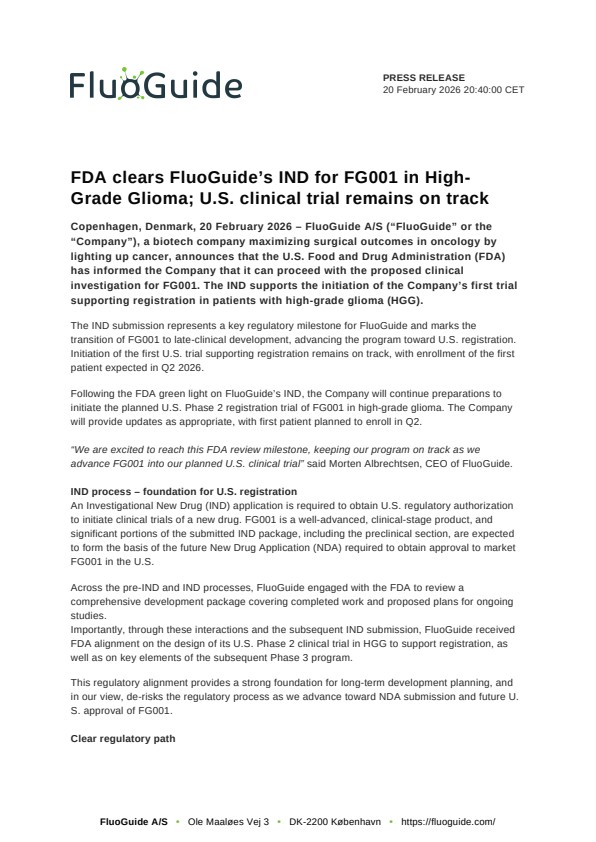 Copenhagen, Denmark, 20 February 2026 – FluoGuide A/S (“FluoGuide” or the “Company”), a biotech company maximizing surgical outcomes in oncology by lighting up cancer, announces that the U.S. Food and Drug Administration (FDA) has informed the Company that it can proceed with the proposed clinical investigation for FG001. The IND supports the initiation of the Company’s first trial supporting registration in patients with high-grade glioma (HGG).
