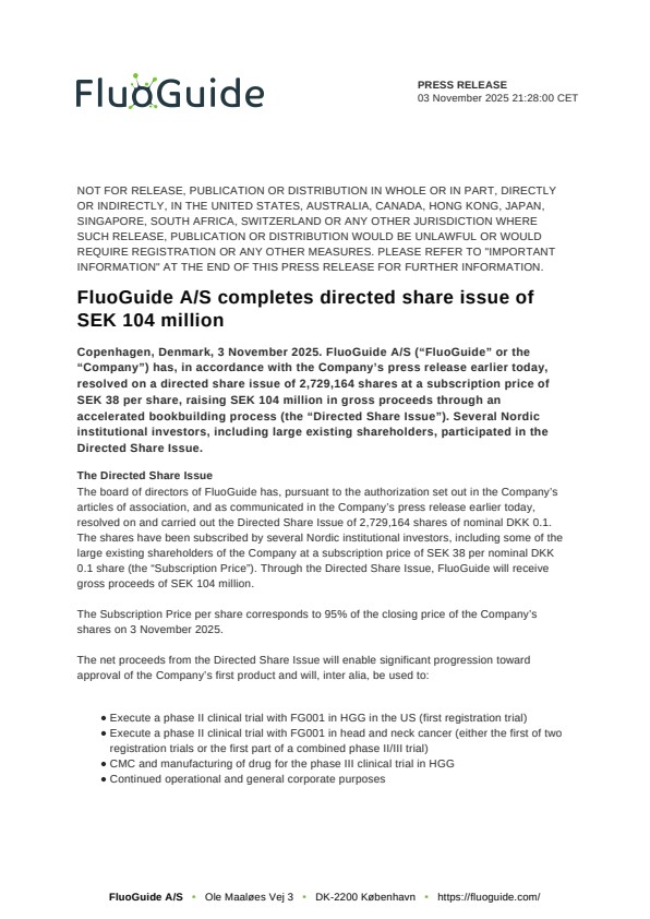 Copenhagen, Denmark, 3 November 2025. FluoGuide A/S (“FluoGuide” or the “Company”) has, in accordance with the Company’s press release earlier today, resolved on a directed share issue of 2,729,164 shares at a subscription price of SEK 38 per share, raising SEK 104 million in gross proceeds through an accelerated bookbuilding process (the “Directed Share Issue”). Several Nordic institutional investors, including large existing shareholders, participated in the Directed Share Issue.