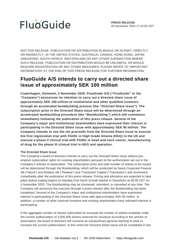 Copenhagen, Denmark, 3 November 2025. FluoGuide A/S (“FluoGuide” or the “Company”) announces its intention to carry out a directed share issue of approximately SEK 100 million to institutional and other qualified investors through an accelerated bookbuilding process (the “Directed Share Issue”). The subscription price in the Directed Share Issue will be determined through an accelerated bookbuilding procedure (the “Bookbuilding”) which will commence immediately following the publication of this press release. Several of the Company’s major and institutional shareholders have expressed their interest in participating in the Directed Share Issue with approximately SEK 95 million. The Company intends to use the net proceeds from the Directed Share Issue to execute the first registration trial with FG001 in High Grade Glioma (HGG) in the US and execute a phase II clinical trial with FG001 in head and neck cancer, manufacturing of drug for the phase III clinical trial in HGG and operation.
