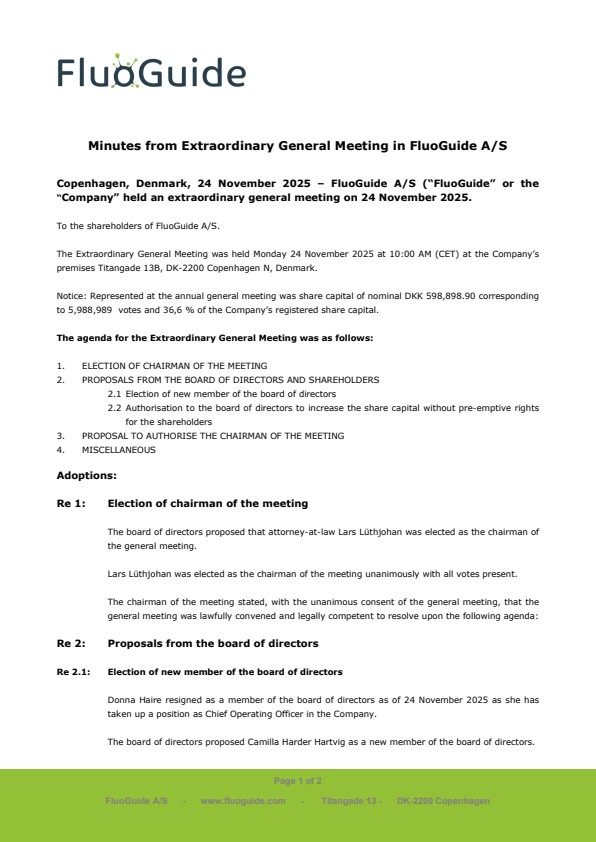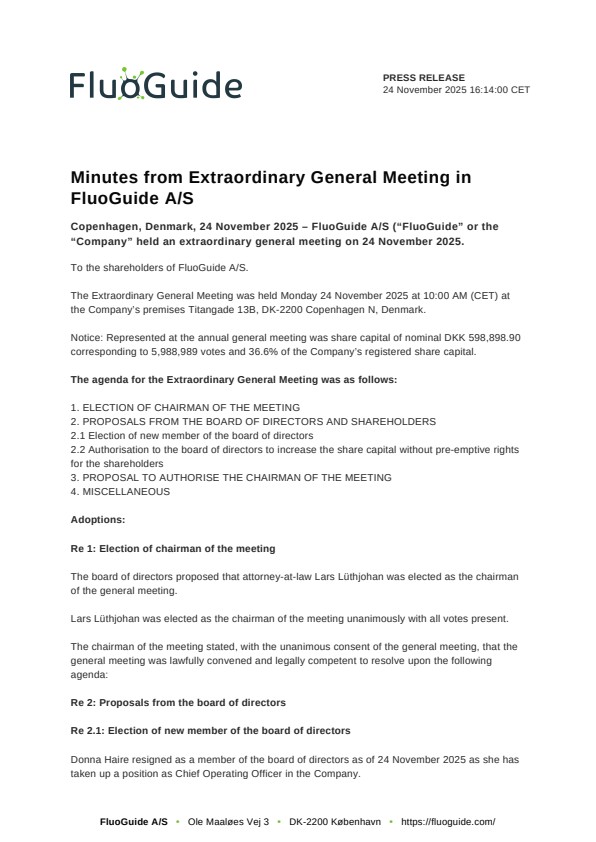 Copenhagen, Denmark, 24 November 2025 – FluoGuide A/S (“FluoGuide” or the “Company” held an extraordinary general meeting on 24 November 2025.
