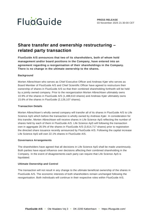 Morten Albrechtsen’s wholly owned company will transfer all of its shares in FluoGuide A/S to Life Science ApS which before the transaction is wholly owned by Andreas Kjær. In consideration for this transfer, Morten Albrechtsen will receive shares in Life Science ApS reflecting the number of shares held by each of them in FluoGuide A/S. Life Science ApS will following the transaction own in aggregate 26.5% of the shares in FluoGuide A/S (3,614,717 shares) prior to registration the directed share issuance recently announced by FluoGuide A/S. Following the capital increase Life Science ApS will own 22.1% shares in FluoGuide A/S.